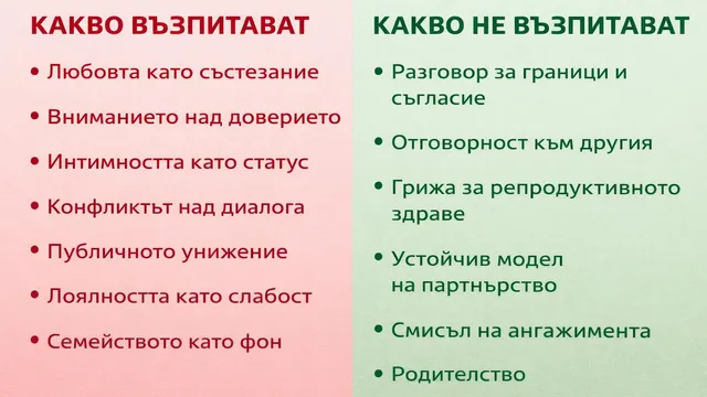 Докато училището мълчи за отношенията, интимността и отговорността, масовите формати вече са поели ролята на възпитател – не с уроци, а с повторение. Форматите не просто отразяват обществото – те го тренират. И когато това „обучение“ е единственото системно, което достига до младите хора, последствията не са културен спор, а обществен резултат.