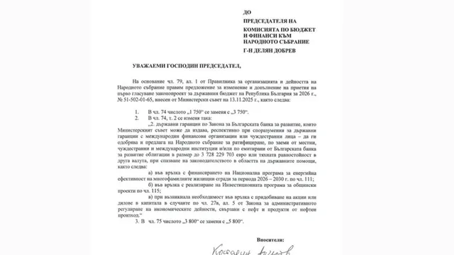 На 24.11.25 г. в парламентарната комисия постъпва документ с номер 51-554-04-461 с вносители Костадин Ангелов от ГЕРБ-СДС, Кирил Добрев от БСП, Павела Митова от "Има такъв народ" и Йордан Цонев от "ДПС-Ново начало".