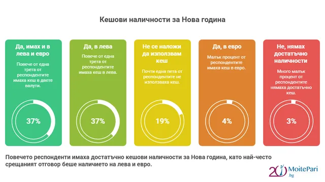 94% от анкетираните не са срещнали проблеми при картови плащания след 1 януари. При кешовите разплащания обаче има затруднения – 37% са посрещнали годината с левове и евро, 37% само с левове, а едва 4% само с евро.