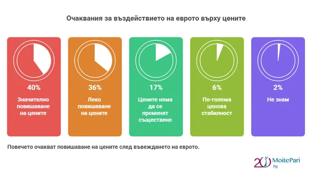 Най-сериозното притеснение остава инфлацията – 76% очакват повишение на цените, като 40% прогнозират значителен ръст, а 36% – по-умерено поскъпване заради закръгляне. Само 6% вярват, че еврото ще донесе ценова стабилност.