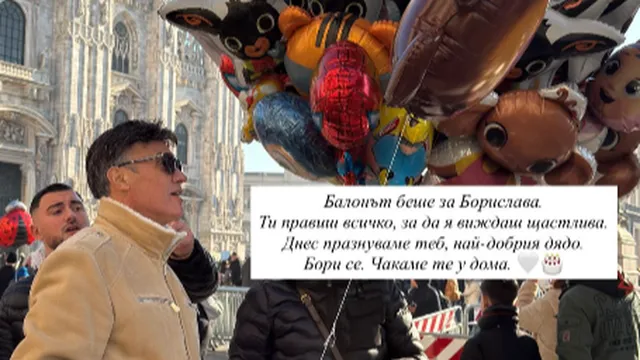 С трогателни думи се включи и Николета Лозанова, която публикува снимка на Борислав Михайлов с балон пред катедралата в Милано. „Балонът беше за Борислава. Ти правиш всичко, за да я виждаш щастлива. Днес празнуваме теб – най-добрия дядо. Бори се. Чакаме те у дома“, написа тя.