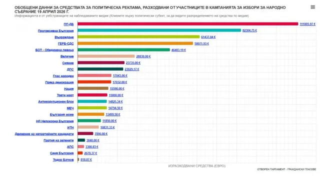 На първо място по направени разходи са от "Продължаваме промяната - Демократична България" със 111 006 евро, втори са от "Прогресивна България" със 82 305 евро, а на трето място са "Възраждане" с 61 437 евро.