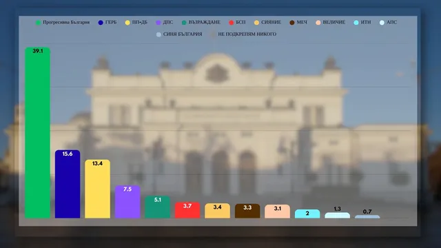 "Прогресивна България" печели убедително с 39.10%, втори са ГЕРБ-СДС с 15.60%, трети са ПП-ДБ с 13.40%.