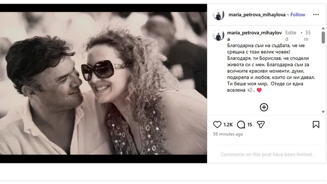 Съпругата на легендата Борислав Михайлов, бившата гимнастичка Мария Петров, сподели мъката си от смъртта му в социалната мрежа Instragram.
