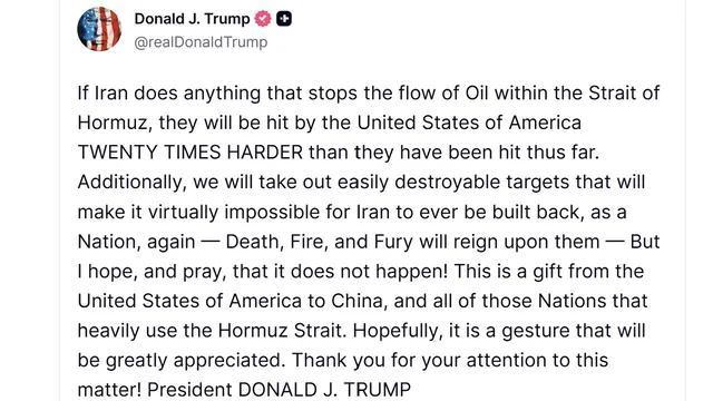 В публикация в социалните мрежи Тръмп заяви, че ако Техеран предприеме действия, които спрат потока на петрол през протока, Съединените щати ще реагират „двадесет пъти по-силно“.